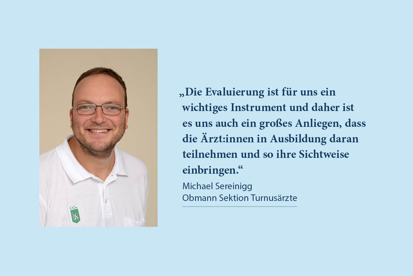Michael Sereinig, Obmann der Sektion Turnusärzte, betont in diesem Zusammenhang: „Die Evaluierung ist für uns ein wichtiges Instrument und daher ist es uns auch ein großes Anliegen, dass die Ärzt:innen in Ausbildung daran teilnehmen und so ihre Sichtweise einbringen.“
