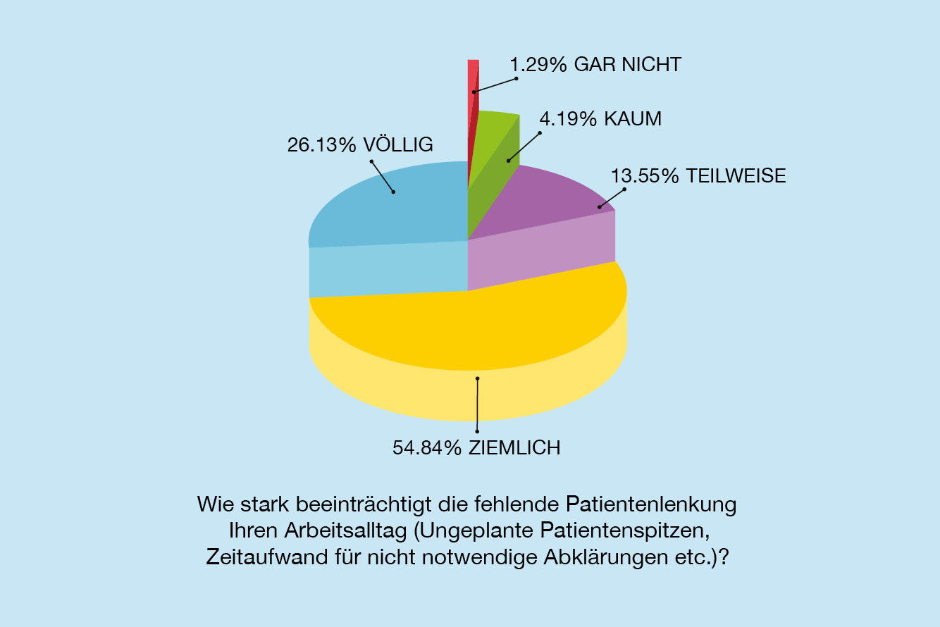 81 % der Ärzt:innen geben an, dass die fehlende Patientenlenkung ihren Arbeitsalltag durch ungeplante Spitzen, unnötige Abklärungen und zusätzlichen Zeitaufwand völlig oder ziemlich stark beeinträchtigt.
