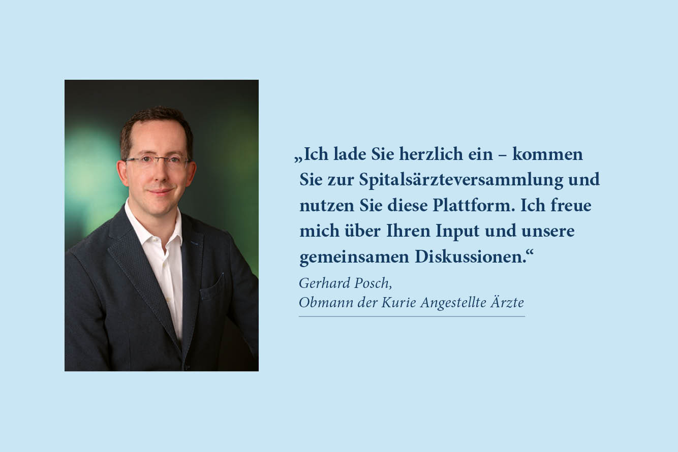 Überhaupt sind die individuellen Interessen der Standorte und die Themen, die von den angestellten Ärzt:innen vor Ort angesprochen werden, wesentlich, betont Gerhard Posch, Obmann der Kurie Angestellte Ärzte: „Ich lade Sie herzlich ein – kommen Sie zur Spitalsärzteversammlung und nutzen Sie diese Plattform. Ich freue mich über Ihren Input und unsere gemeinsamen Diskussionen.“