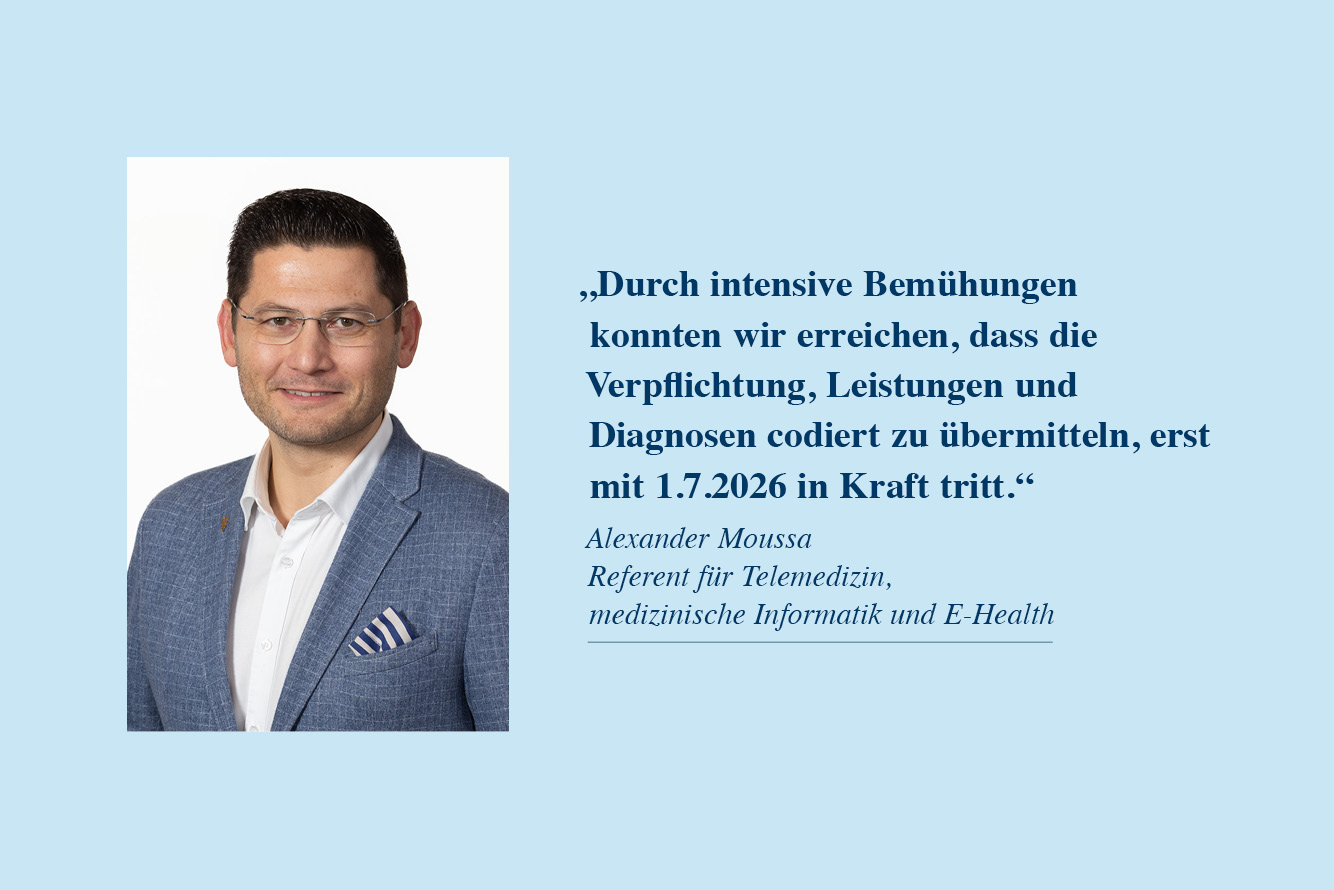 „Aufgrund unserer intensiven Bemühungen konnten wir erreichen, dass die gesetzliche Verpflichtung, Leistungen und Diagnosen künftig codiert zu übermitteln, nun erst mit 1.7.2026 in Kraft tritt“, freut sich Moussa über die zeitliche Verschiebung, die allen mehr Zeit für die Vorbereitung verschafft. Dennoch sei eine nachhaltige Lösung wie die E-Diagnose eigentlich das Ziel: „Was wir wollen, ist eine automatische Diagnose-erfassung mit einem Mehrwert für die Ärzt:innen.“