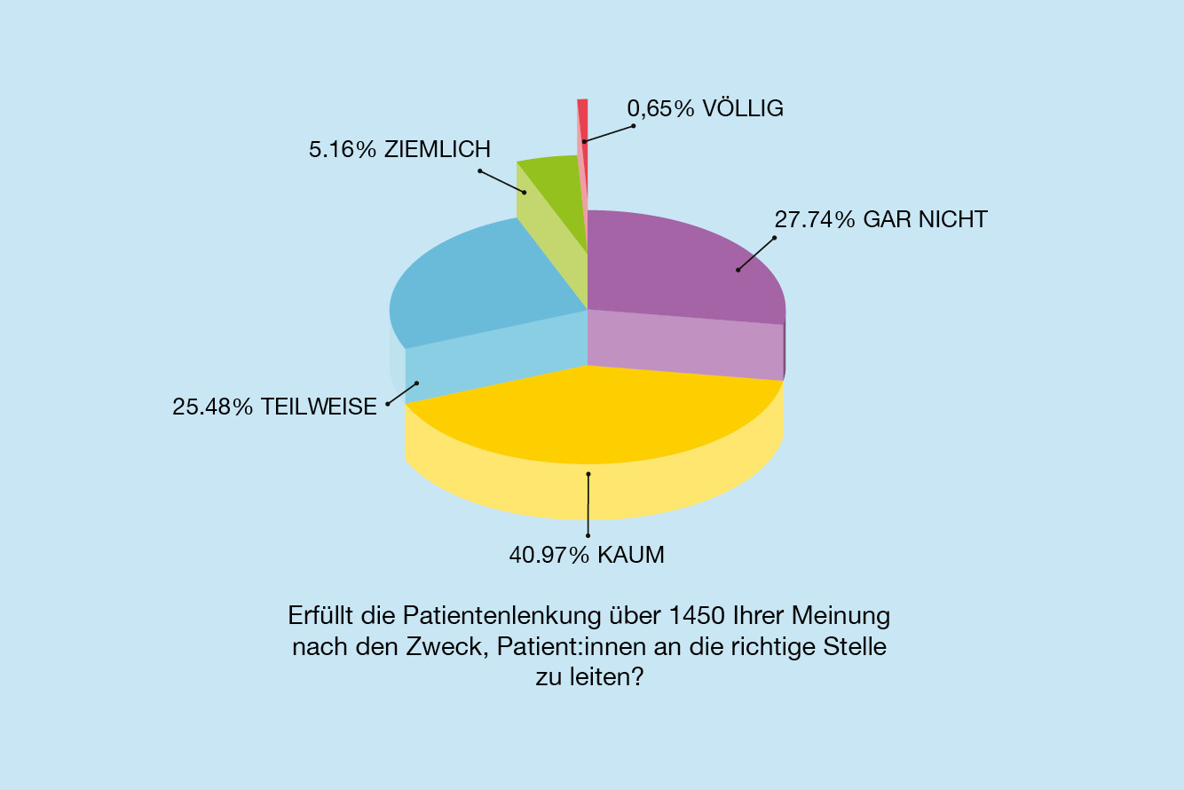 Die Bewertung der Hotline 1450 fällt ernüchternd aus. Rund 28 % der Teilnehmer:innen sagen, 1450 erfülle den Zweck, Patient:innen an die richtige Stelle zu leiten, gar nicht. Weitere 41 % meinen, dies gelinge kaum.