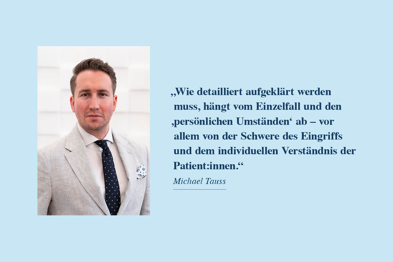 Die ärztliche Aufklärung ist mehr als ein Pflichtgespräch. Vor einer Behandlung ist den Patient:innen in einer für sie verständlichen Weise darzulegen, welche Diagnose vorliegt, welche Behandlungsoptionen bestehen, welche Chancen und Risiken zu erwarten sind und welche Konsequenzen ein Unterlassen zur Folge haben kann. Wie detailliert dabei aufgeklärt werden muss, hängt vom Einzelfall und den „persönlichen Umständen“ ab – vor allem von der Schwere des Eingriffs und dem individuellen Verständnis der Patient:innen bzw. deren Vorkenntnissen.